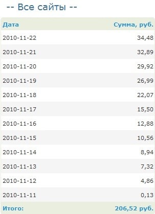 На данный момент общий доход составляет 35 рублей. Сайты добавлены в сапу 11.11.2010. С каждым днем доход уверенно растет на 3-4 рубля (ниже скриншот).