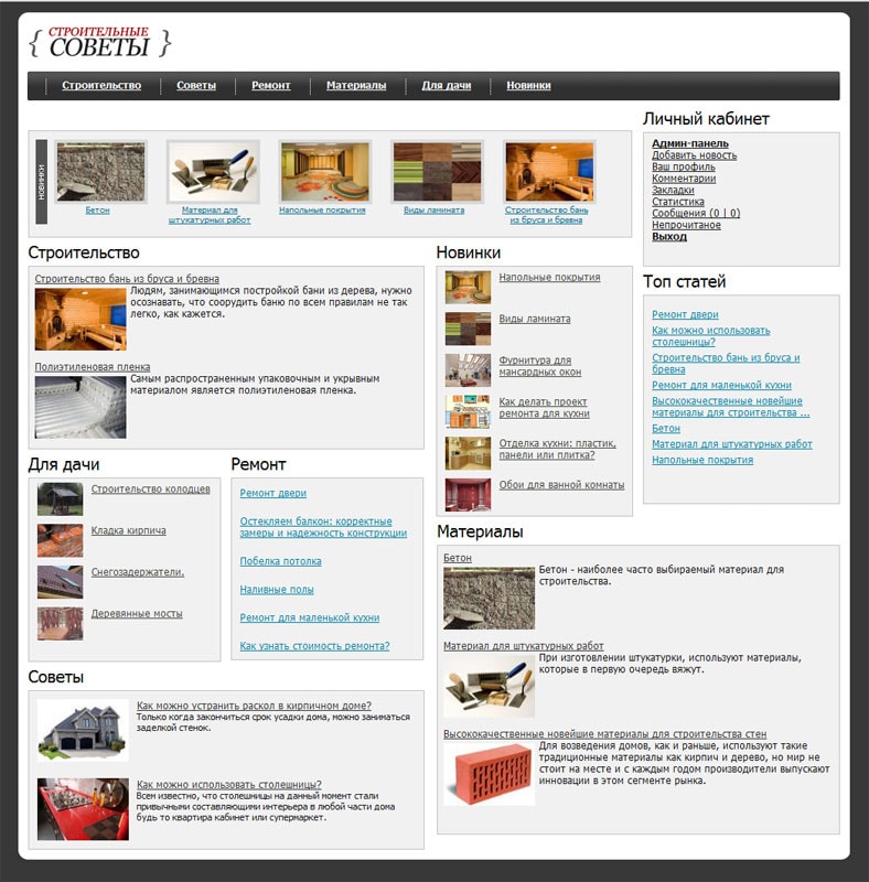 Уникальный дизайн, исходники PSD главной и внутренней странички в комплекте. Сверстан под Firefox, Opera, IE 8. Полезные и интересные статьи общим объемом 75 000 знаков, к каждой статье - картинка. Тематики статей - общетематические статьи по строительству, советы по ремонту, строительные материалы и т.п.
