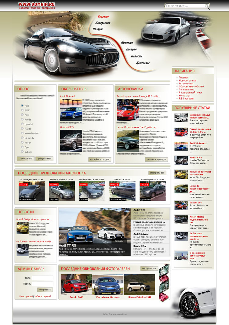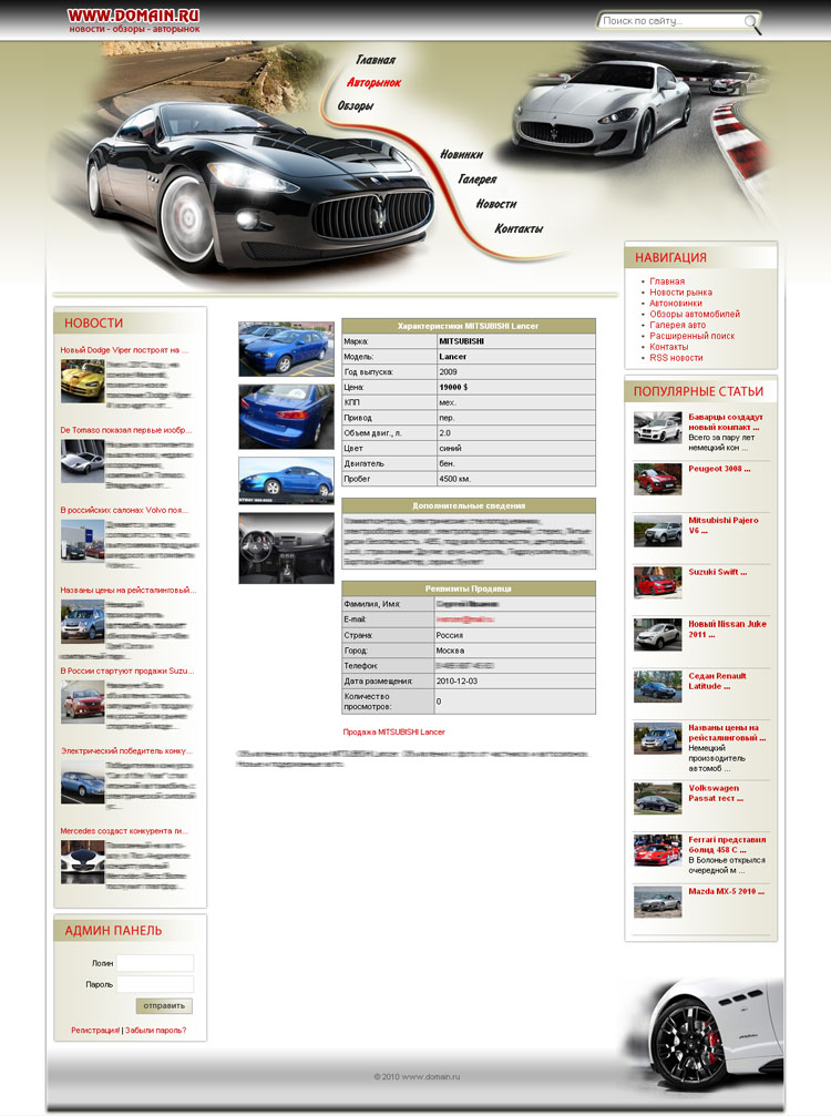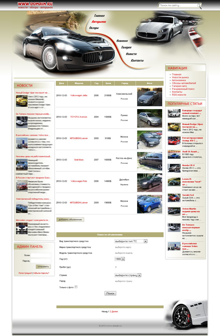 - Модуль Авторынка (предоставляется возможность посетителям сайта размещать объявления о продаже автомобилей).
