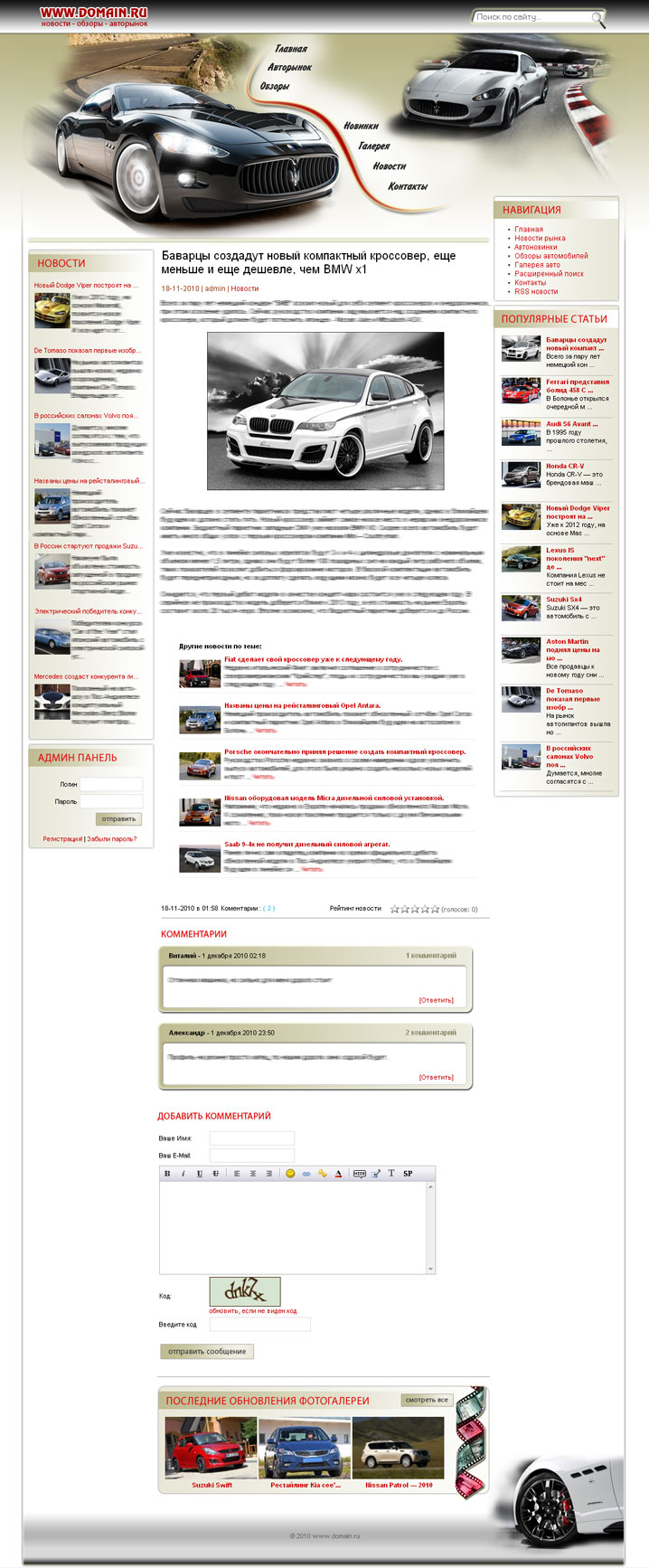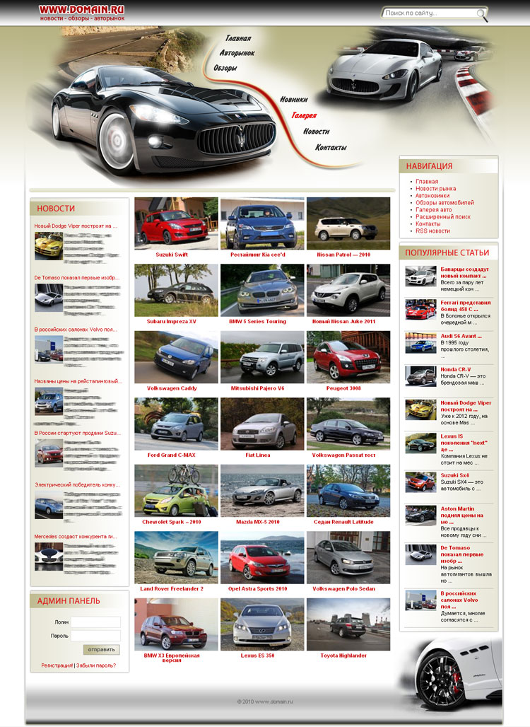 - Фотогалерея, 21 модель автомобилей (21страница). На каждой странице от 8 до 20 уникализированых фотографий соответствующих моделям.