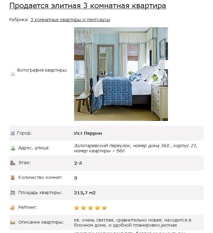 представляют из себя генерированные объявления о продаже элитной недвижимости