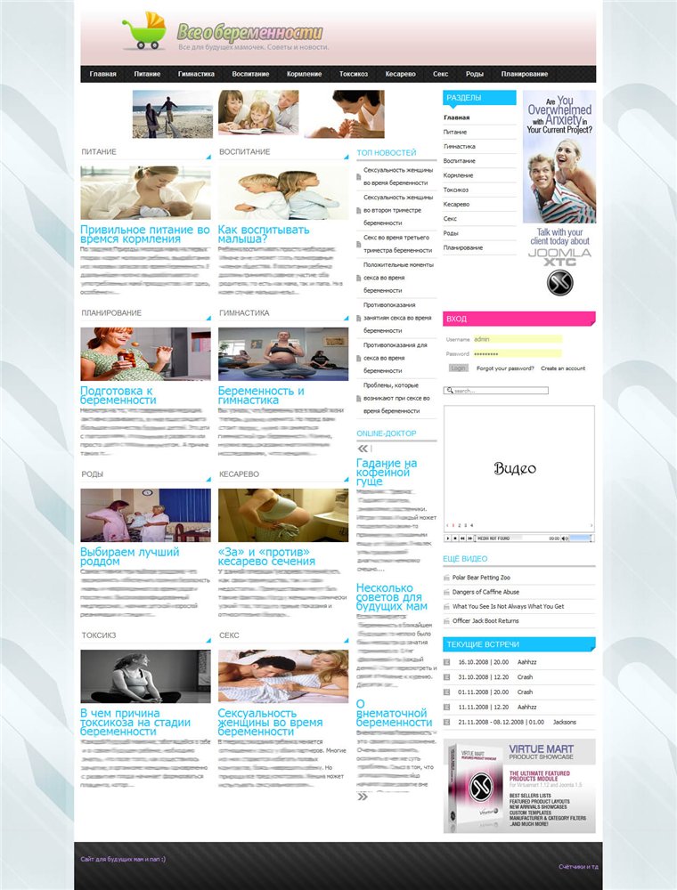 Беременность: Питание, Гимнастика, Воспитание, Кормление, Токсикоз, Кесарево, Секс, Роды, Планирование и Online-доктор.