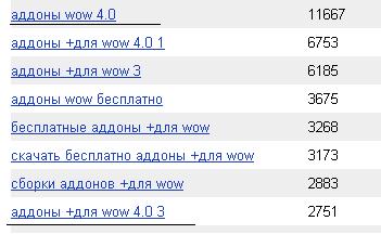 к примеру возьмем запрос в яндексе "аддоны для wow 4.0.3", статистика сайта показывает по 15-20 переходов в сутки по данному запросу, вордстат яндекса показывает 42 запроса в месяц, то есть по 1 запросу в день. Да еще и сайт находится на 10 позиции по данному запросу.