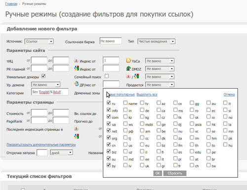 В ручных режимах (в меню слева) выбрать категорию сайтов и, по желанию, доменные зоны: