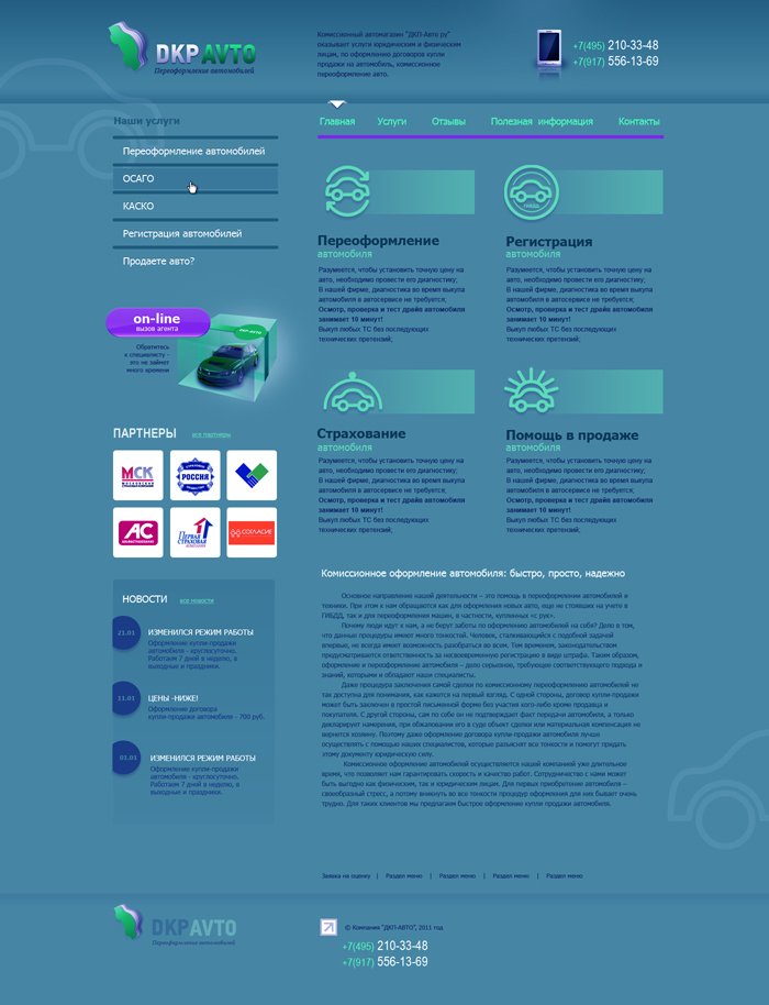 3.2) Меню "Наши услуги": Переоформление автомобилей, ОСАГО, КАСКО, Регистрация автомобилей, Продаете авто?;- услуги будут добавляться поэтому я думаю лучше сделать его вертикальным;