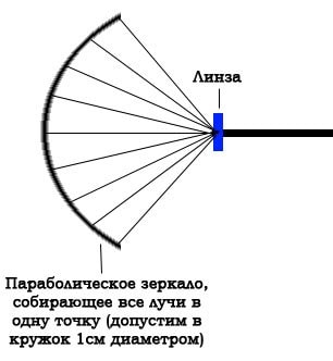 То есть, в месте сбора лучей размещаем линзу (параболическую или гиперболическую, не знаю точно), чтобы этот пучёк лучей распараллеливался, в итоге получаем луч толщиной 1см, обладающей той же энергией.