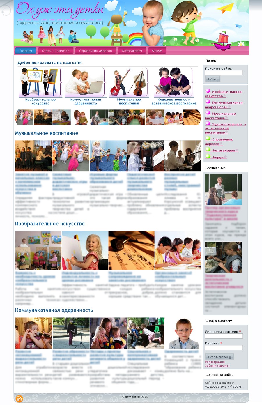 Выставляю на аукцион симпатичный сайтик "Ох уж эти детки" посвященный воспитанию детей, педагогике, детскому творчеству. Движок Drupal 6.0. Сайт без домена, нигде не размещен.
