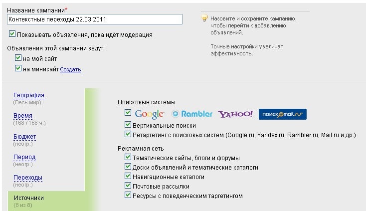 Я создал новую кампанию и увидел, что в ней включены и навигационные каталоги и поисковый ретаргетинг, да и вообще все источники. Получается, что Бегун новым рекламодателям по-прежнему предлагает накрутку счетчиков вместо обещанной рекламы.