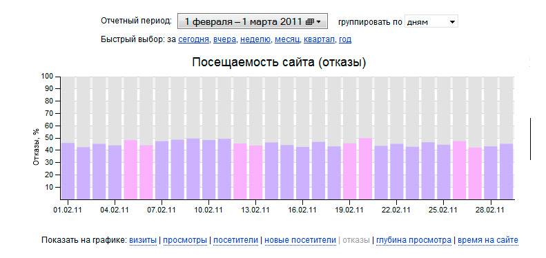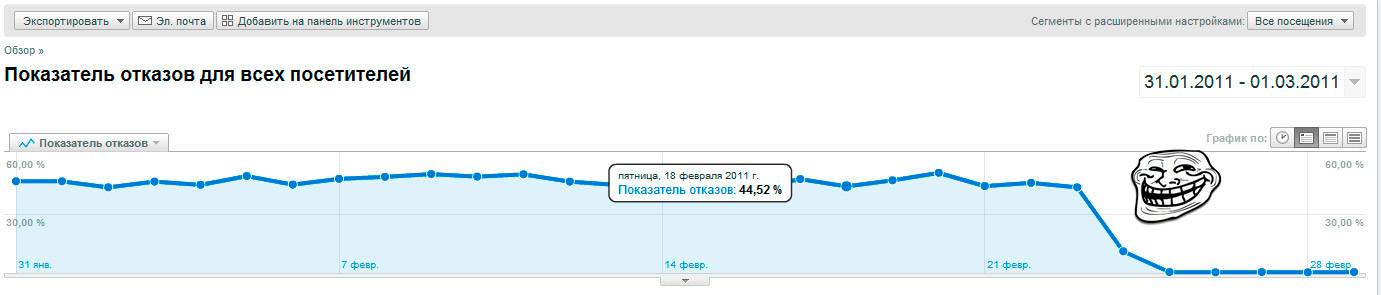 23 февраля видимо хорошо кто-то отметил (во всяком случае в русскоязычном сегменте сервиса), ведь после него наблюдается весьма интересная картина относительно показателя отказов: