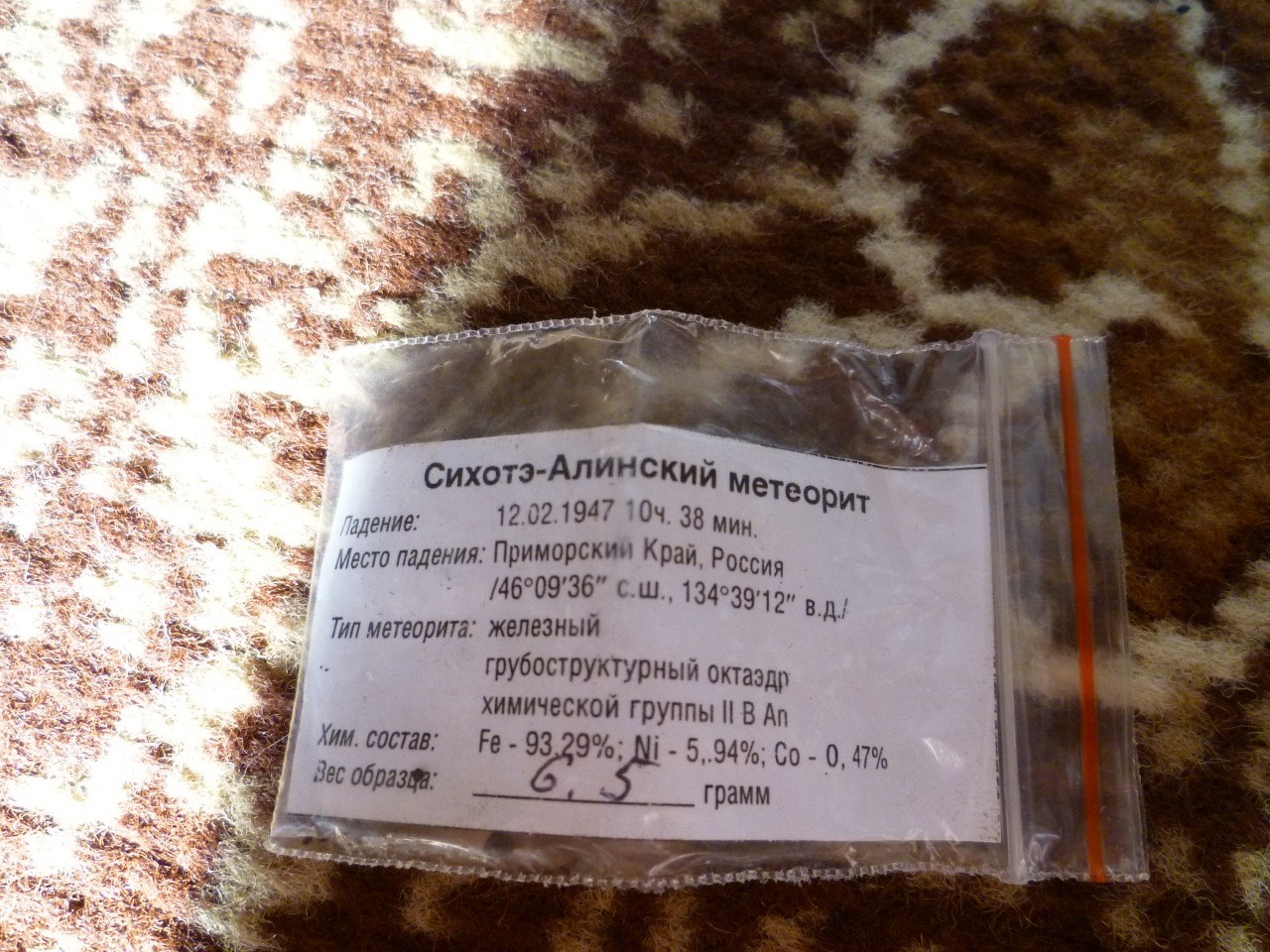 Есть у меня в моей коллекции метеорит. Его полное название Сихотэ-Алинский метеорит, упал он на Землю в далёком 1947 году в горах Сихотэ-Алинь на дальнем Востоке, в воздухе разлетелся на тысячи осколков и выпал в виде железного дождя. Хотелось бы подробнее узнать может ли он быть радиоактивным? Какая его примерная цена сегодня?