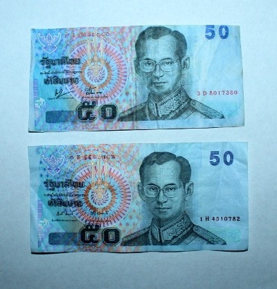 Сверху - криво обрезанная копия, снизу - обычные 50 бат.