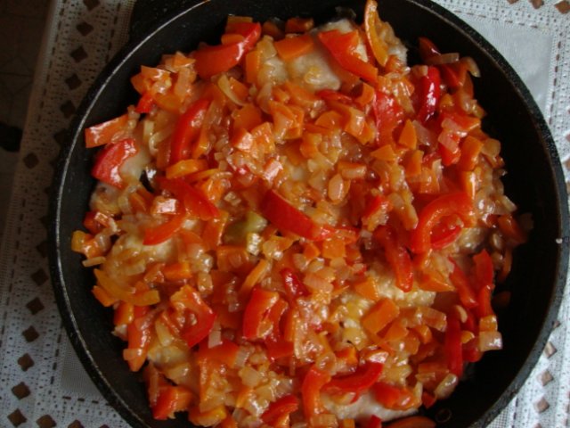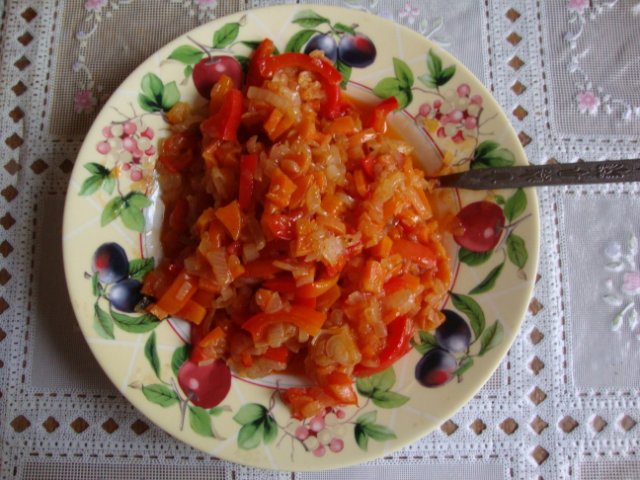 Готовим зажарку. Побольше. 3-4 луковицы, большая морковка, большая перчина. Обжариваем все на масле, добавляем томатную пасту, отгоняем желающих съесть все прямо сейчас. В итоге должно получиться примерно так.