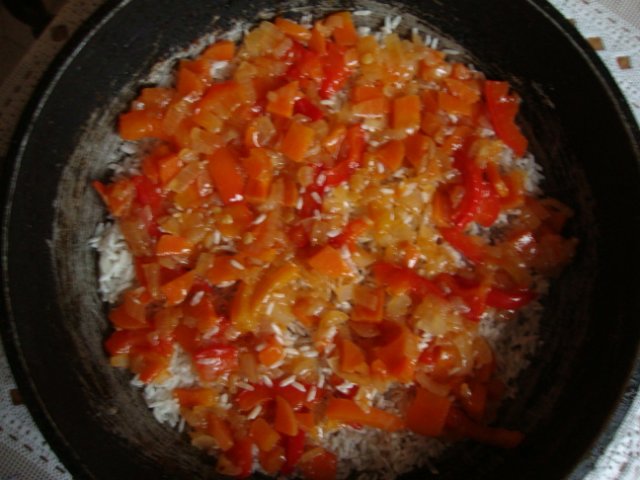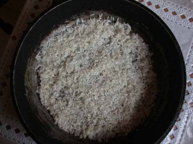 Берем чугуниевую посуду потолще и достаточной глубины, укладываем на дно рис слоем в сантиметр (больше не стоит, бо рис увеличивается). На мою сковородку, это порядка 170 мл риса.