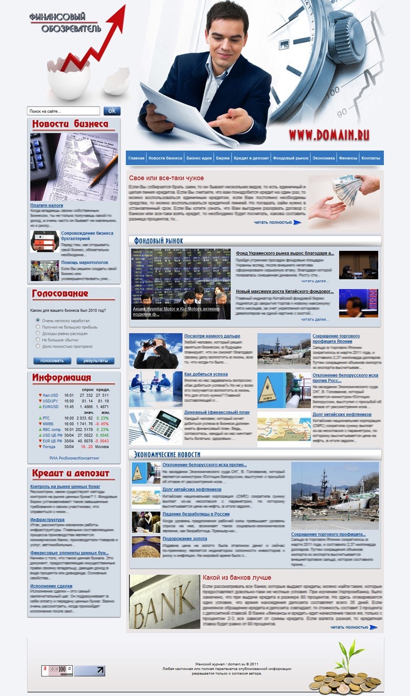 - В блоке "Информация" размещен информер о курсах валют и биржевых индексах.