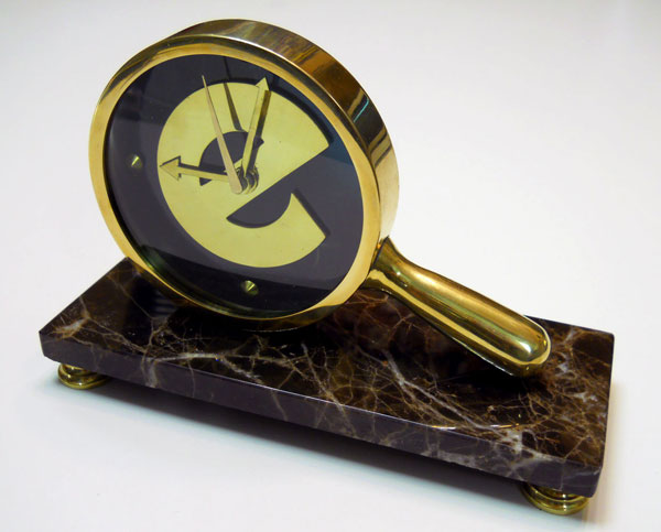 Вместо стекла стоит стеклянная линза от китайской лупы, корпус часов выточен из 100мм болванки весом два кило, основание из очень дорогого африканского мрамора – набрал образцов на Стройэспо)