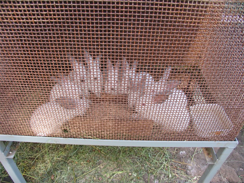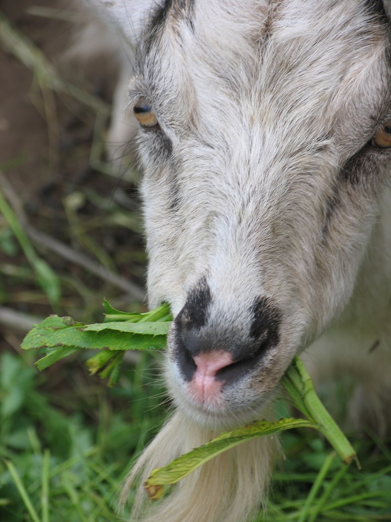 Коза обыкновенная, делит территорию вместе с кроликами, ворует у них сено и подъедает упавший комбикорм – тоже самое есть и у нее, но видимо чужое вкуснее.