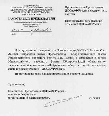 Я работаю начальником образовательного учреждения в составе ДОСААФ России. По уставу мы негосударственное образовательное учреждение, каких по стране сотни. На днях нам пришло для ознакомления распоряжение, в котором сообщается, что всю структуру ДОСААФ Председатель Совета общества Маев С. А. по собственной инициативе "записывает" в Народный фронт. Точнее — подаёт заявку Путину на вступление.