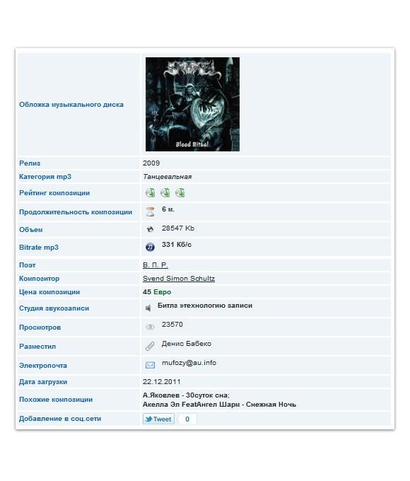 Описание: Описания и характеристики песен mp3 с использованием упоминаний композиторов, поэтов, качества композиций, длительности и т.д. Уникальная информация в тексте материала по всем категориям. Использовано уникальное оформление материалов для людей. Заголовки “заточены” под нч, нк, сч, ск запросы. Уникальная методика - добавлена кнопка "Twitter".