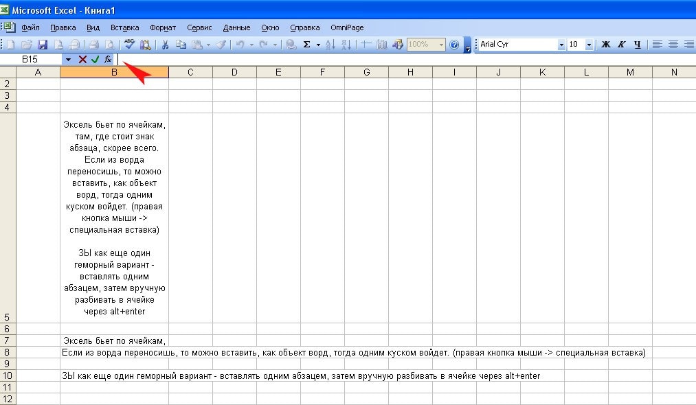 ЗЫ как еще один геморный вариант - вставлять одним абзацем, затем вручную разбивать в ячейке через alt+enter