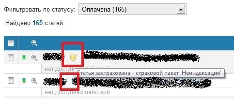 и в списке размещенных статей видите, какая застрахована (она щитом отмечена), а какая нет (без щита)