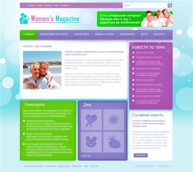 Дизайн: уникальный, все блоки выводяться с новостей, картинки в шапке меняються.