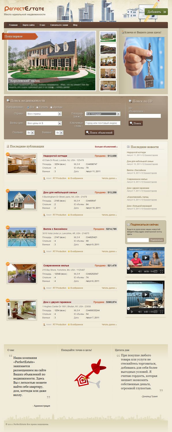 Контент: 80 000 символов б/п, рерайт/копирайт (отношение 5/1); сайт в будущем можно без проблем наполнять. Пользователи могут добавлять свои объявления по недвижимости (функцию можно отключить). Есть несколько видео. Записи "растянуты" с мая по август 2011 года.