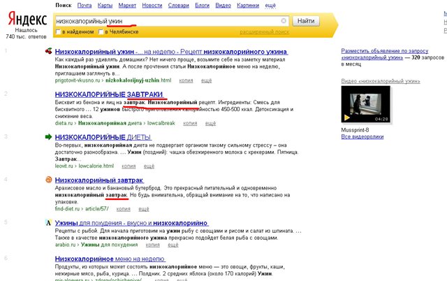 выдача при запросе "низкокалорийный ужин"), теперь слово "завтрак" в сниппете.