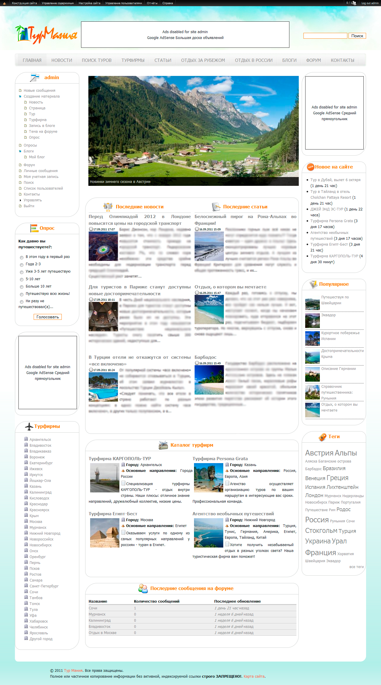Контент: более 100к символов без пробелов (40% копирайтинга, 60% рерайтинга). Уникальность 95-100%. Тексты в основном про отдых в различных странах и городах. К большинству материалов прилагается картинка. Добавлено несколько туров и турфирм.