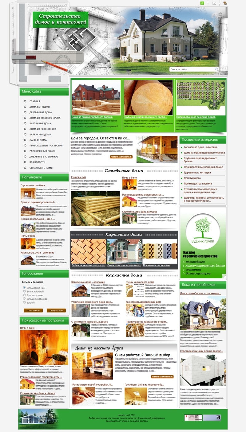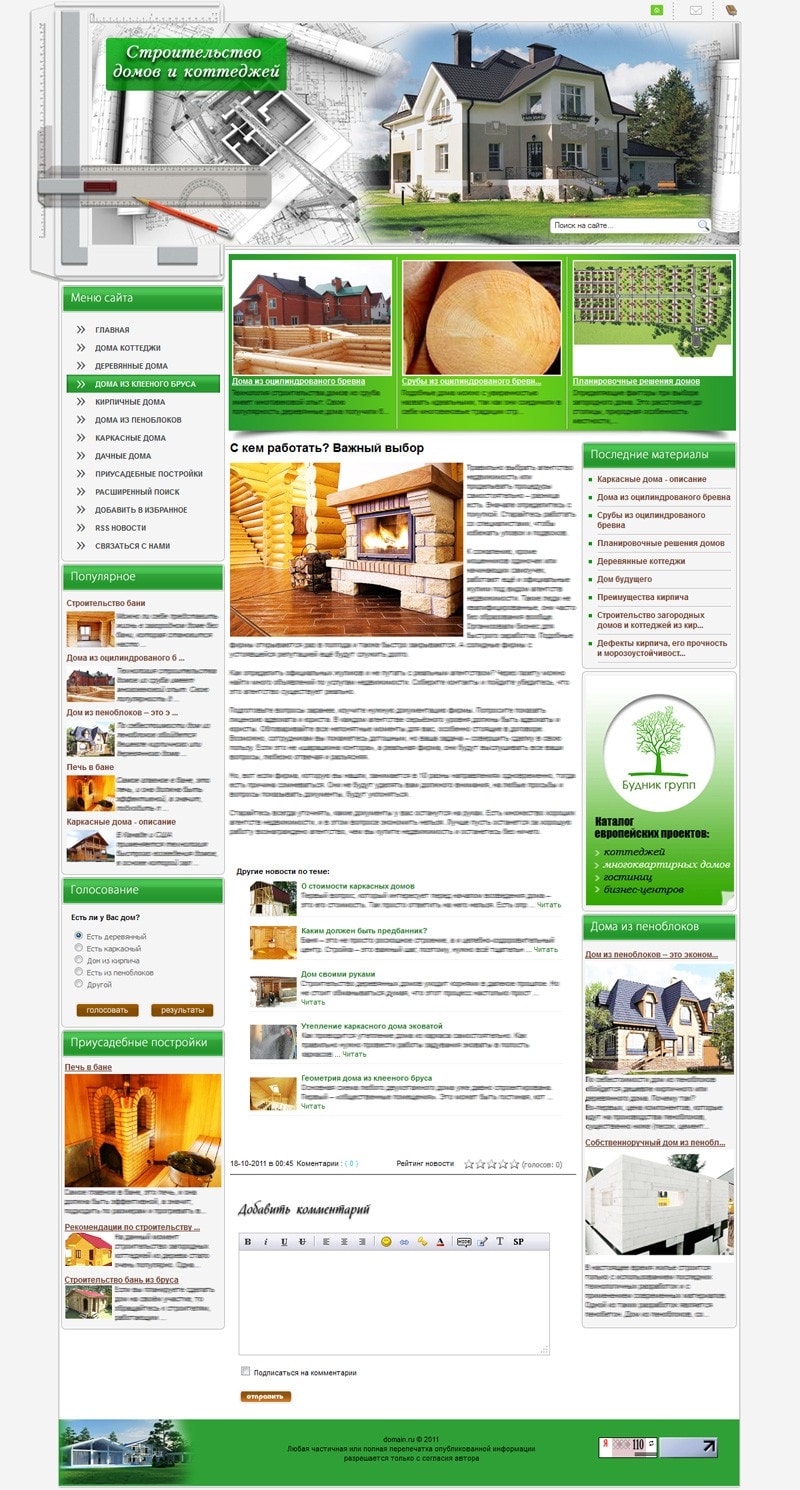- Блок "Деревянные дома" выводит автоматически анонсы последних статей из раздела деревянные дома.