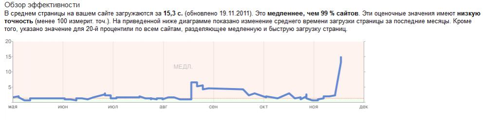 Вот этот параметр иногда скачет, недавно был приличный, такой, что писали, что загружается быстрее, чем почти все, а сейчас глянул за 15,3 с. (обновлено 19.11.2011). Это медленнее, чем 99 % сайтов