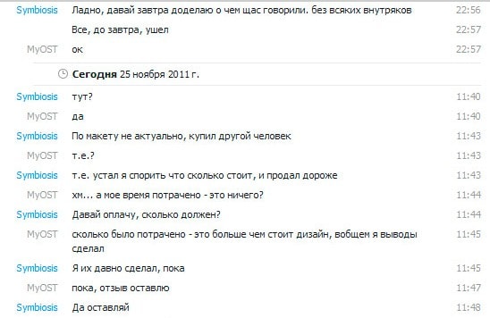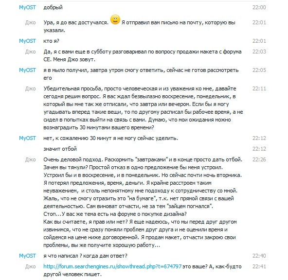 Сразу отмечу, что 29,30 я не получал сообщений кроме "завтра". 31, пол часа назад мне дали отбой. Тут я скорее уже не выдержал такого отношения. Прождать у компьютера с утра до вечера трое суток - слишком. Т.к. он говорил не только "завтра", но и "обсудим вечером, сейчас занят". Куда тут мне уйти. Я ждал простого обещания выйти на связь. Дурак.