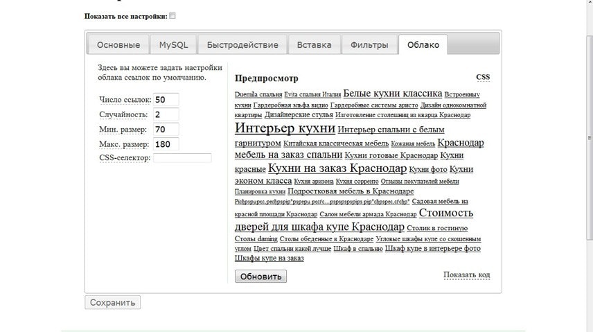 1. У вас в коде вставке облака, наверное, параметр числа ссылок вставлен. Если он есть в коде то число ссылок из админки игнорируется.