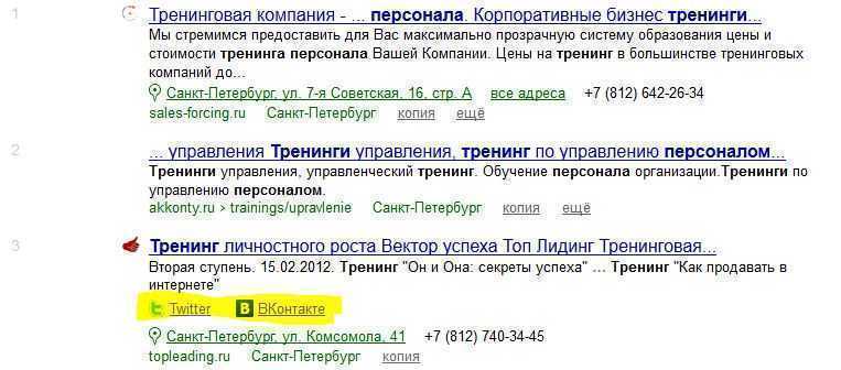 Недавно яндекс начал выдавать в поиске, рядом с адресом сайта, ссылки на их социальные сервисы.