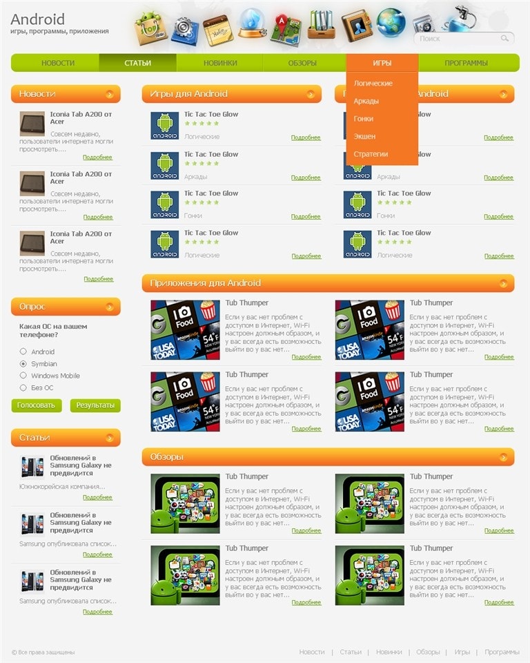 Контент: 100 игр и программ (загрузочные файлы .apk чистые присутствуют в архиве с сайтом), 15 статей и обзоров устройств работающих на ОС Android