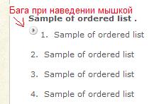 Там на той странице где написано "Sample of ordered list" - т.е. где используются простые теги <li> без всяких классов - глюк при наведении мышкой на список (сдвигается вправо+появляется картинка со стрелкой).