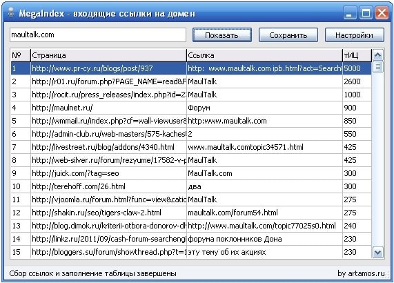 Парсер "MegaIndex - входящие ссылки на домен" позволяет быстро посмотреть данные на указанный домен, а также сохранить таблицу в exel для дальнейшего анализа группы сайтов. Таблица данных имеет структуру из 4 колонок (№, Страница, Ссылка, тИЦ). Через сервис MegaIndex можно просматривать первые 1000 найденных ссылок, которые отсортированы в порядке убывания тИЦ, пример видно на скрине программы.