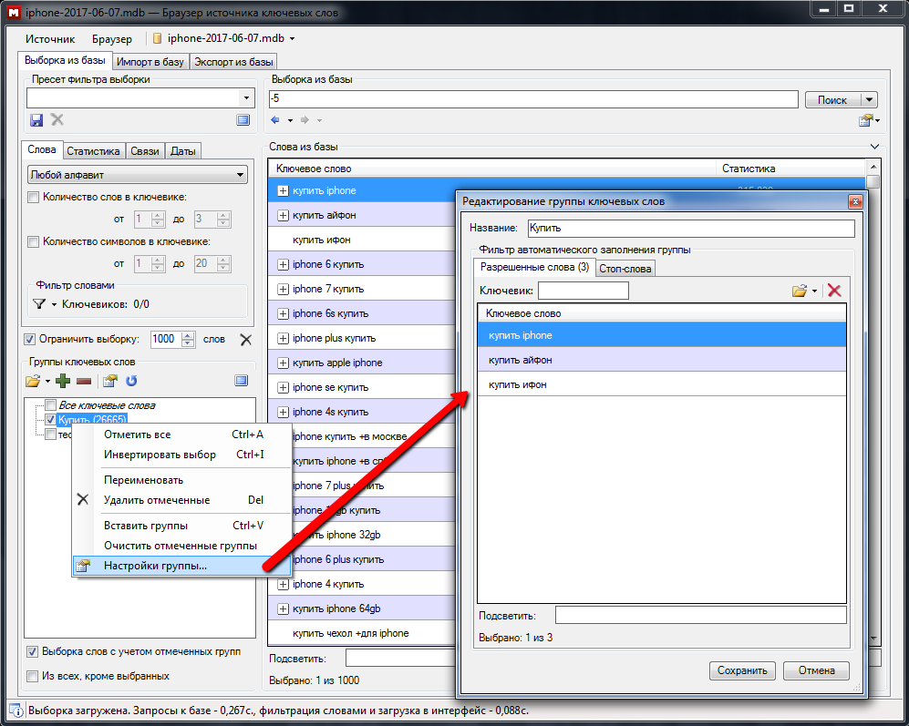 — Реализован экспорт ключевых слов из произвольного списка хранимых в базе групп