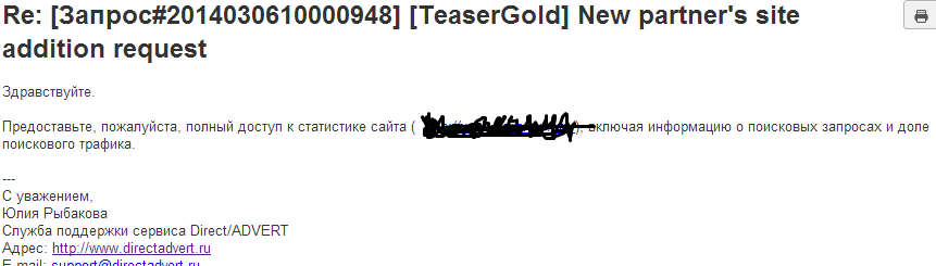 Я по поводу вашего нового проекта TeaserGold. Зарегистрироваться мне удалось, но почему то мою площадку отклонили (м.б. из-за того что я уже состою в Direct/ADVERT?).