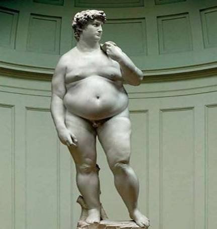 в интернетах видел статую Давида 21 века, ожиревшего от фаст-фуда )) Не могу найти, бло бы в тему ))