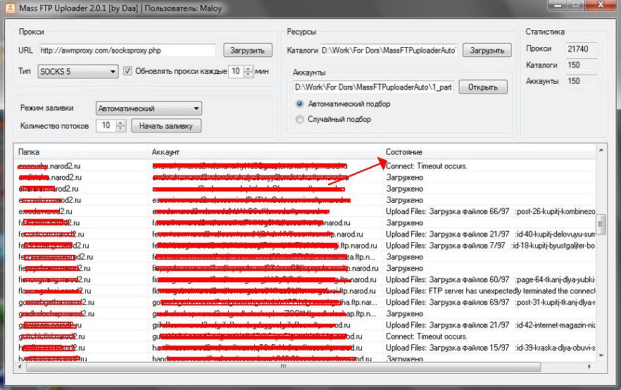 5. Автоматическая заливка. Производится по кругу, если при заливке была получена ошибка от фтп сервера - то переходит к следующему аккаунту в очереди, а отпавший ставит в конец очереди.