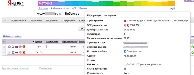 А тут уже не первый раз так: первый заход с поиска по ключу в ТОП 10, и далее в день 2-3 раза прямые заходы по 10-14 секунд. Первый раз это заметила пару месяцев назад. Заходы были с одного и того же IP. После 15 захода закрыла доступ через Апач. Неделя перерыв и опять по другому похожему ключу заход с поиска и каждодневная бомбёжка от 1 до 4 раз в день. IP отличался только последними цифрами и был каждый новый заход одинаковый. Я снова запретила ему доступ. А теперь такая же история, но совсем сложная для моего понимания. Метрика определяет посетителя как одного и того же, но уже пятнадцатый раз это новый IP. Манера поведения та же.