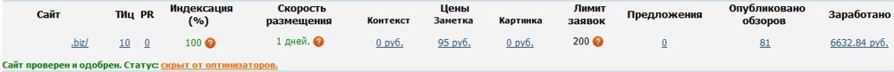 Доходы: сайт принят в GGL, сейчас скрыт от оптимизаторов. Размещен 81 обзор, 100% индексация.