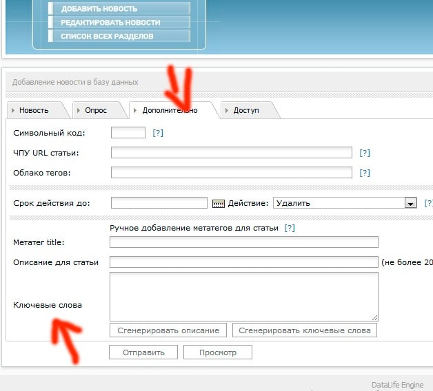 Панель управления → Редактировать новости → Новость → Вкладка «Дополнительно» → Поле «Ключевые слова».