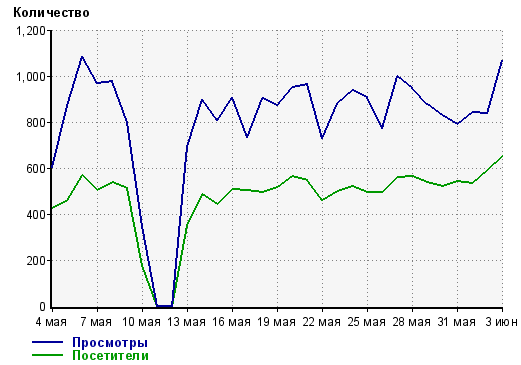 Посещаемость за месяц (несколько дней переносили на другой хостинг, были проблемы с ДНС):