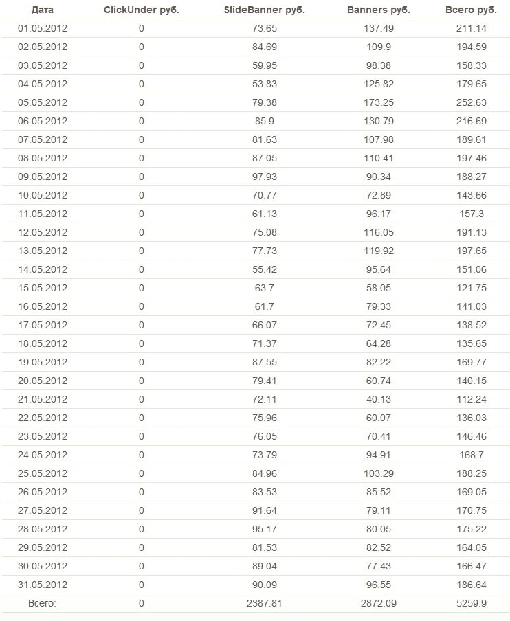 баннеры от ричмедиапартнерок (realtraf, ICQAdvert, AdvMaker) стоят в ротации. Так что капает в трех местах одновременно. Все поп- кликандеры снял, хотя с них тоже капало около 200 руб в сутки. Но, есть мнение что яндексу оно не нравится, хотя на этом сайте никаких репрессий за этот формат рекламы не было.