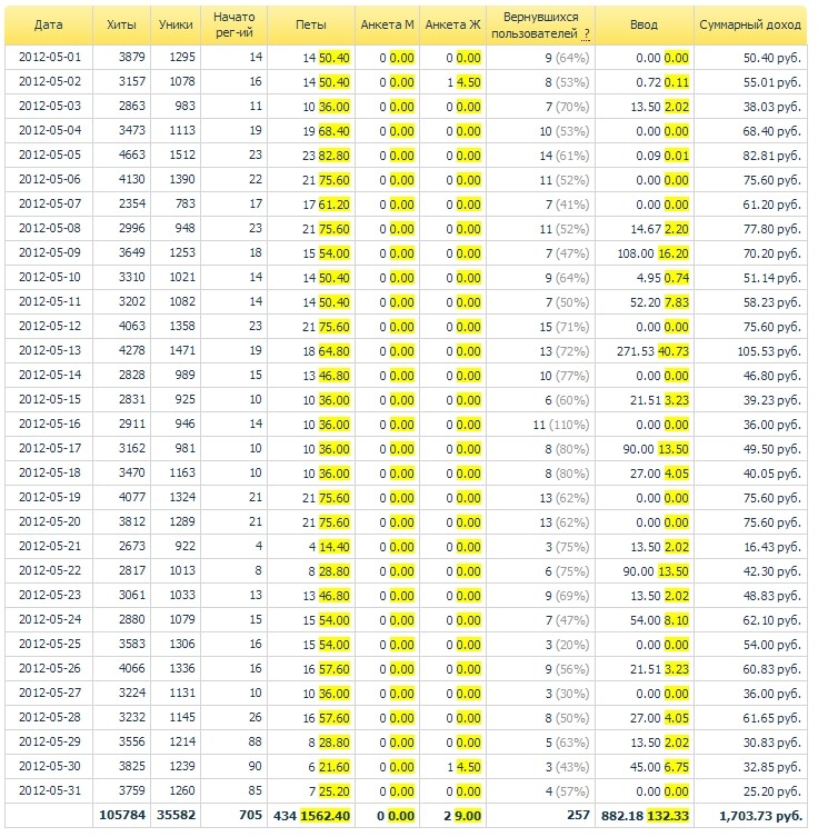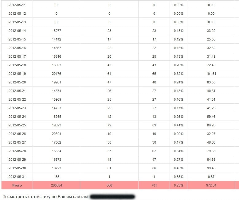Кстати, в начальном посте забыл указать, что в ротации рич-медиа-баннеров стоит еще mediarich.ru (slinding banner), с которого, за Май, к примеру, накапало около 2000. Так что общий доход с сайта можно оценивать около 17 тыр в месяц...
