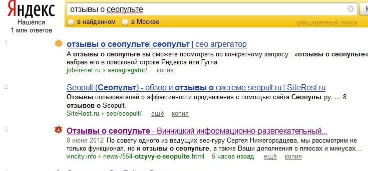 Решил по Вашему примеру попробовать этот же запрос отзывы о сеопульте продвинуть без внешних ссылок.