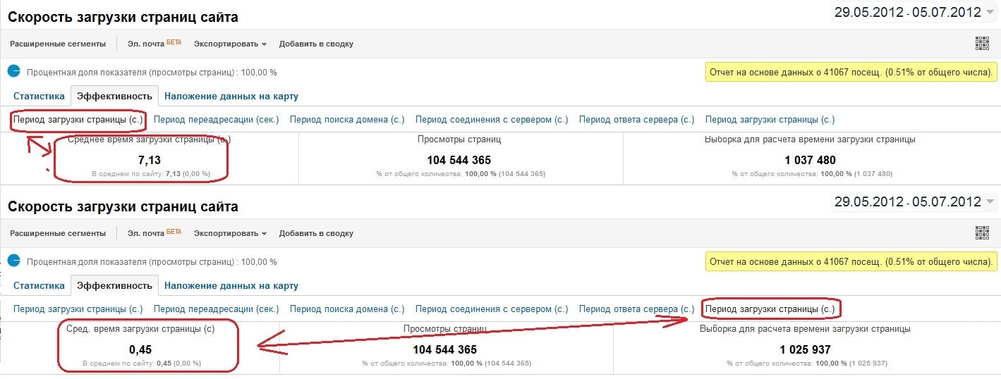 1. В закладке "Эффективность" есть два параметра "Период загрузки страницы", значения которых у меня очень отличаются: на первом 7,13 с, на втором 0,45 с. Какая разница в данных параметрах?