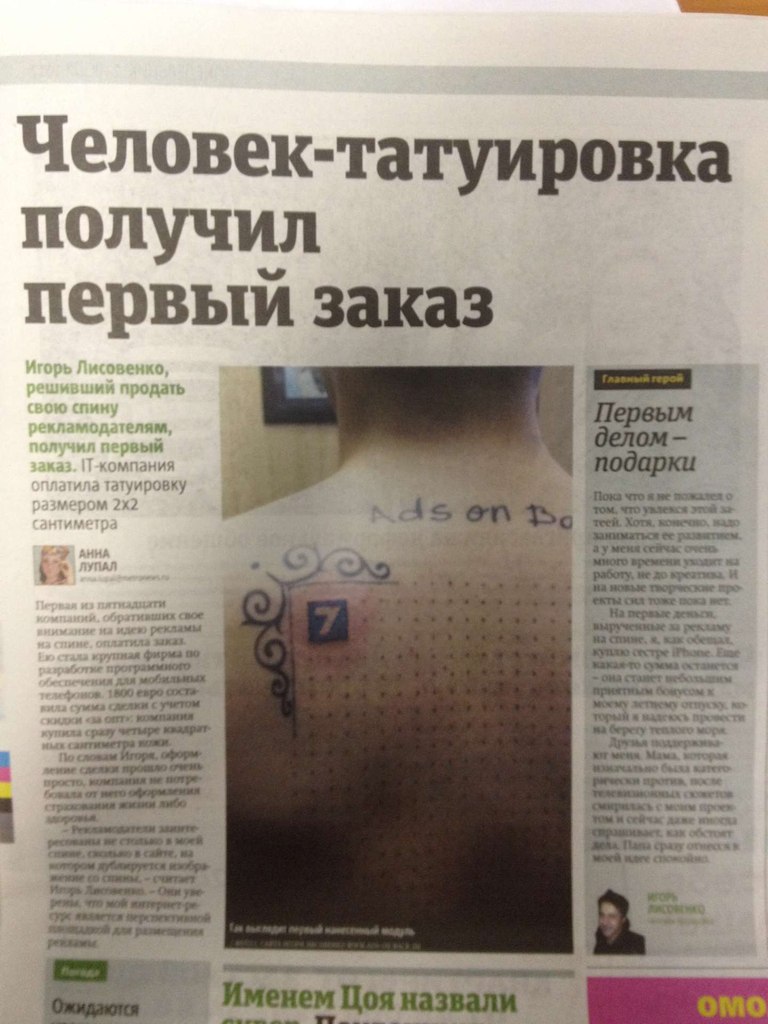 Некоторые думаю, что идея бред и не прижевется... У каждого есть право мыслить, как ему хочется, никто не осуждается за это... НО хочется сказать, что один заказчик уже есть (нанесена татуировка и реклама), второй заказчик также есть и 12-07-2012 будет наносится татуировка и реклама второго заказчика рекламы. Это минимум доказывает то, что у людей интерес к проекту есть.