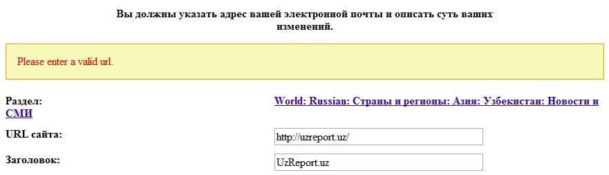 Добрый день! Мы недавно изменили домен нашего сайта http://uzreport.uz и пришлось отправить заявку в dmoz для обновления url, но при отправке заявки выходит ошибка - Please enter a valid url. Не пойму в чем проблема. Помогите пожалуйста.